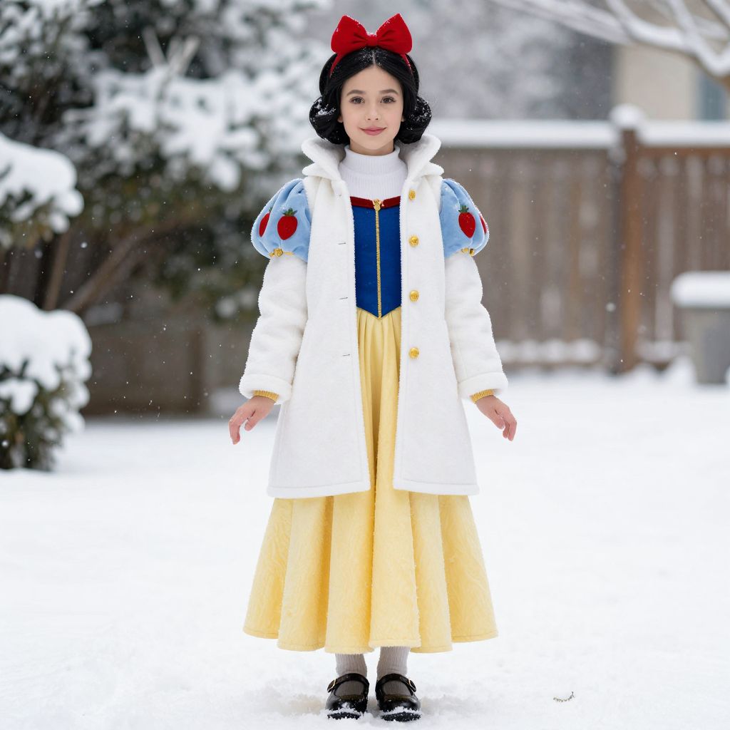 Photograph of a Snow White cosplay doll in a snowy backyard, wearing a white coat, yellow dress, blue bodice, red bow, and black