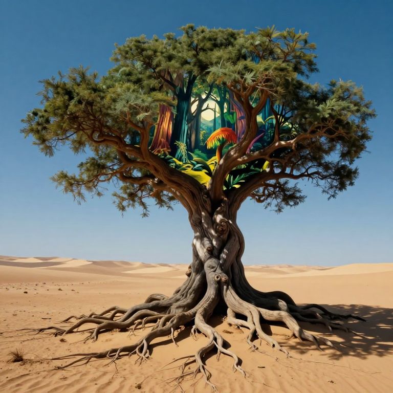 Photorealistic digital artwork of a majestic, ancient tree with a thick, gnarled trunk and sprawling roots in a vast, sunlit desert. The tree's dense, green foliage contrasts with colorful, animated birds and tropical plants peeking through its branches. The clear blue sky and golden sand dunes form the background, creating a striking juxtaposition of natural and fantastical elements. The image blends realistic textures with vibrant, whimsical details, evoking a sense of wonder and magic in a stark, arid landscape.