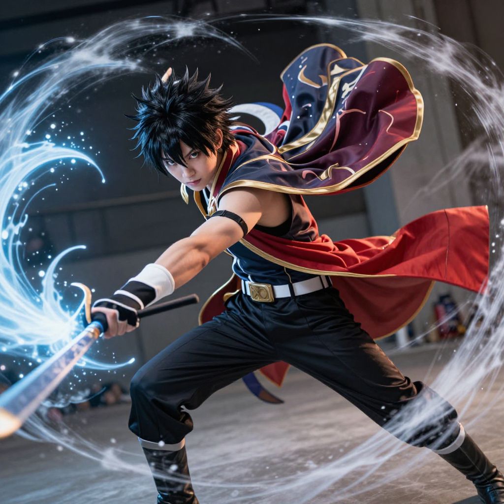 Kishibe Young cosplay mid-action during a fantasy duel with energy waves and wind effects, dramatic pose, sharp lighting, bold colors, anime action scene, cinematic, high detail, Flux style.