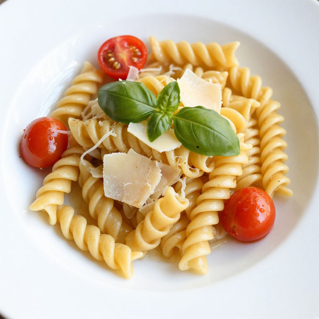 Golden pasta twirls elegantly atop a pristine white plate, adorned with vibrant cherry tomatoes, crumbled Parmesan cheese, and fresh basil leaves, creating a visually appealing and appetizing dish.