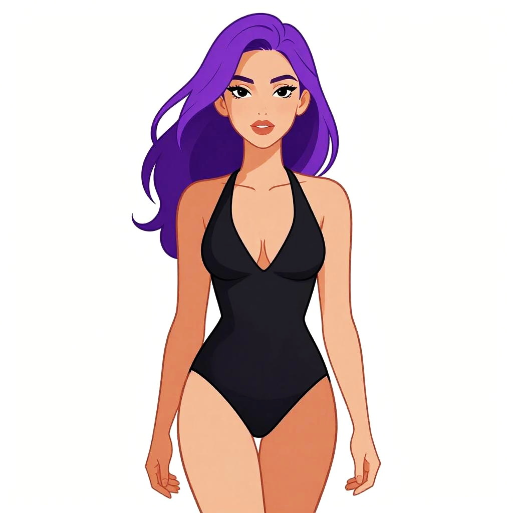 Woman with pretty face and pretty hair. Woman, minimalist swimwear, black one-piece swimsuit, plunging halter neckline, high-cut leg openings, seamless construction, plain white background. --sref 1467