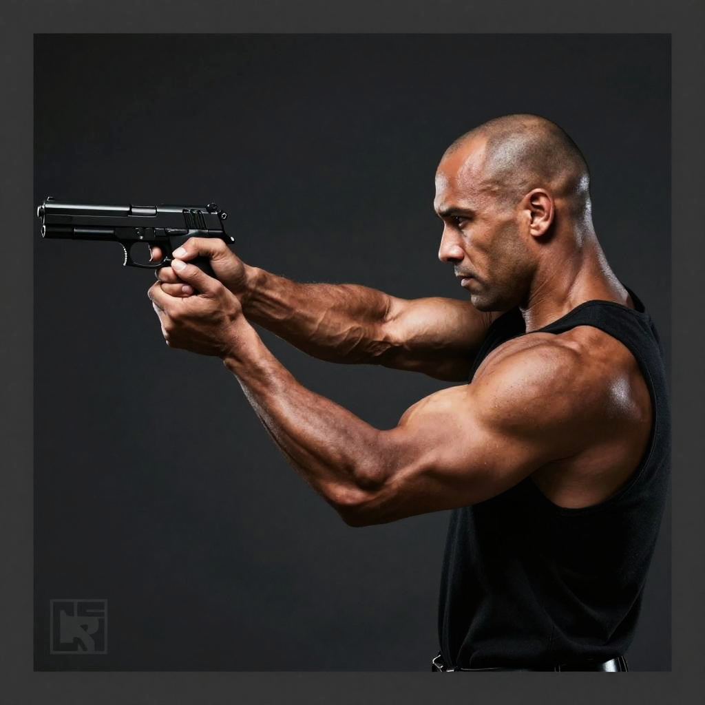 Photograph of a muscular, bald man with a medium skin tone, wearing a black tank top, aiming a black handgun with both hands. He's positioned in profile, against a dark, textured background. The lighting highlights his strong arms and focused expression. The image has a dramatic, intense vibe with a gray border and a watermark in the lower left corner.