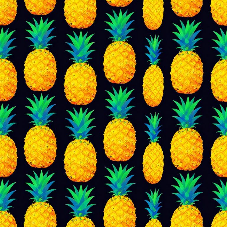 The image presents a vibrant, pop art-inspired pattern featuring multiple pineapples. The pineapples are depicted in a stylized, exaggerated manner, with bold, contrasting colors that create a striking visual effect. The pineapples are arranged in a repeating, grid-like pattern, with each pineapple occupying a distinct space within the composition. The pineapples are primarily yellow with green leaves, and they are set against a dark, almost black background, which makes the bright colors of the pineapples stand out even more. The leaves are depicted in shades of green and blue, adding a cool contrast to the warm yellow of the pineapples. The overall composition is balanced and symmetrical, with the pineapples evenly spaced and aligned, creating a sense of order and harmony. The use of bright, saturated colors and the stylized depiction of the pineapples give the image a playful, whimsical feel, characteristic of pop art.