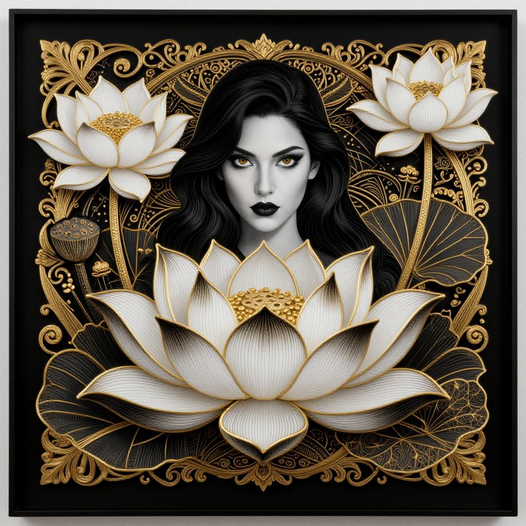 A black lotus artwork with intricate gold detailing and white lotus flowers, featuring a woman with dark hair and a striking expression.