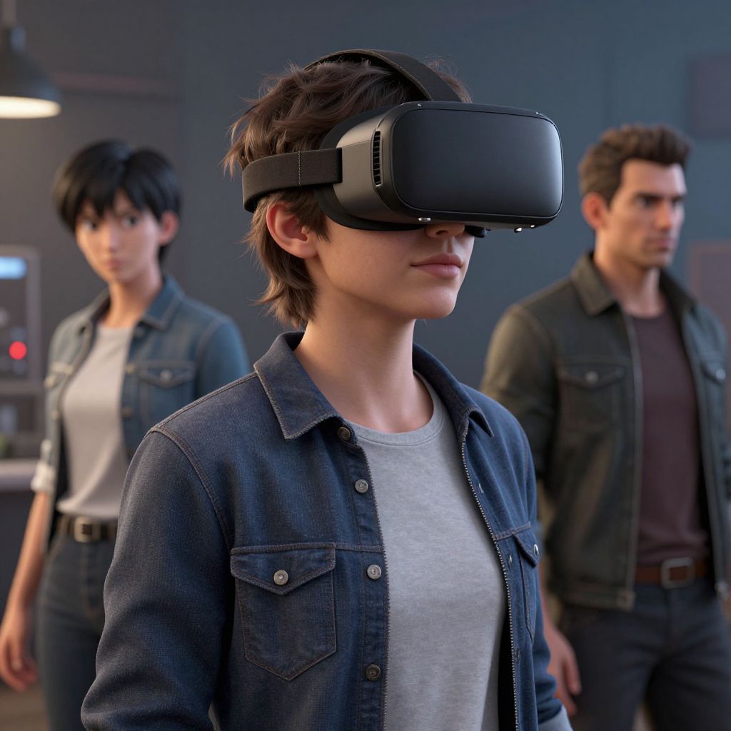Photograph of a young woman with short, dark hair wearing a black virtual reality headset, a gray t-shirt, and a blue denim jacket. She stands in a dimly lit room with two men in the background, both wearing casual clothing—jeans and jackets. The man on the left has short, dark hair and a light gray shirt, while the man on the right has dark, curly hair and a dark brown shirt. The background includes blurred, modern-industrial elements and soft lighting. The woman's expression is focused and calm.