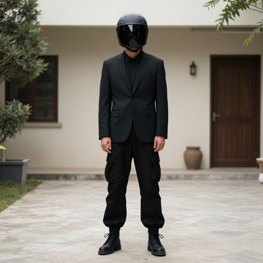 "Black Cargo Pants Outfit, man in a black suit and helmet standing in a courtyard"