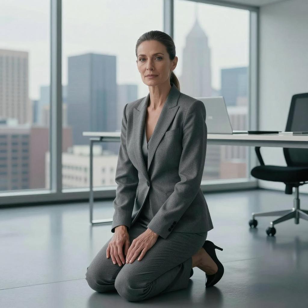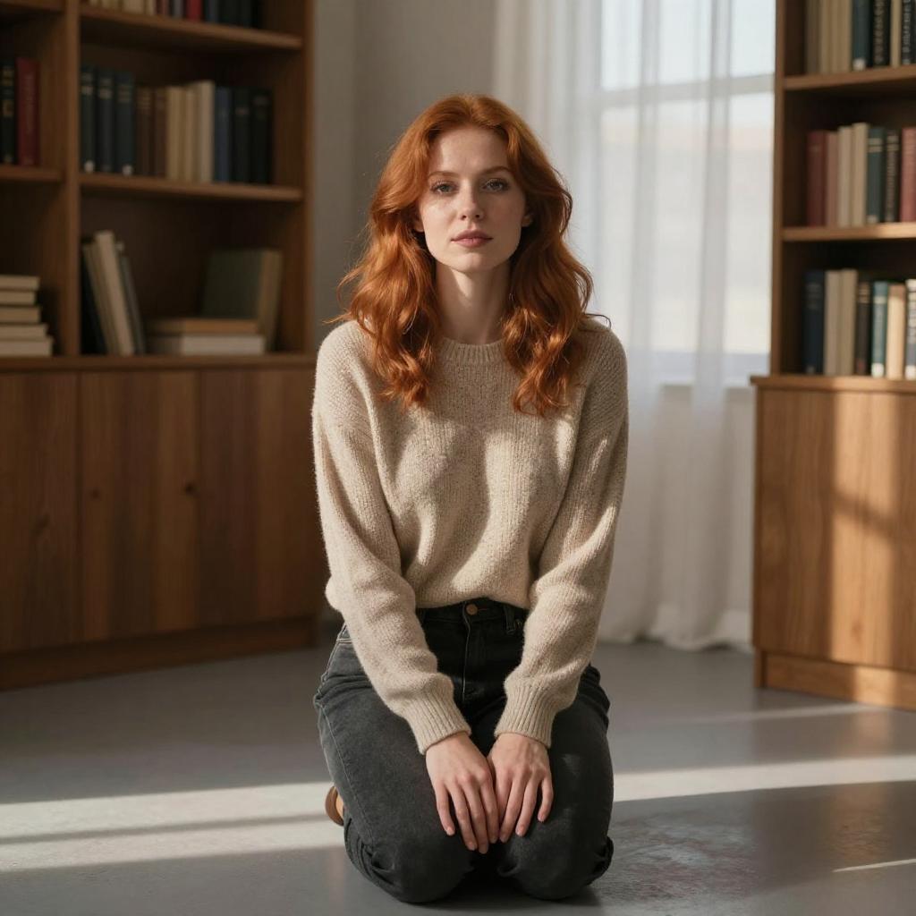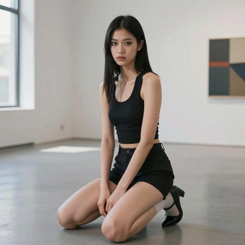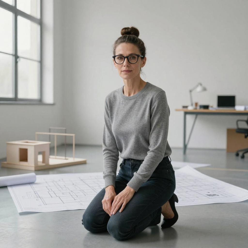 Photorealistic editorial portrait of a young female yoga instructor with braided hair and athleisure wear kneeling on a gray floor in a bright sunlit yoga studio with wooden panels and large windows. Direct confident gaze at the lens, soft natural morning light filtering through blinds sculpting facial features and gentle highlights. Clean minimal interior, subtle glass reflections, balanced composition, shallow depth of field, refined color grading, natural skin texture, crisp details, contemporary mood, high-resolution, professional styling, elegantly posed, negative space preserved, symmetrical lines, polished yet realistic finish.
