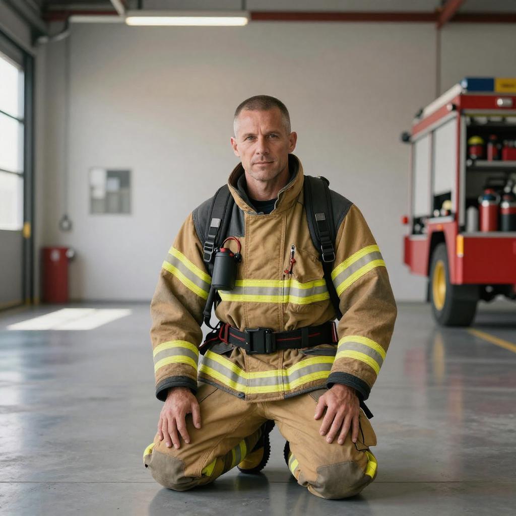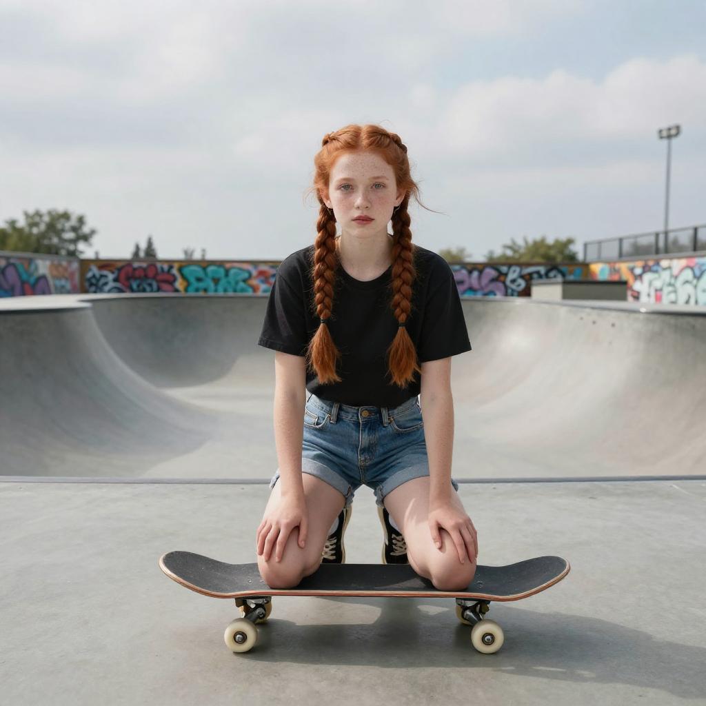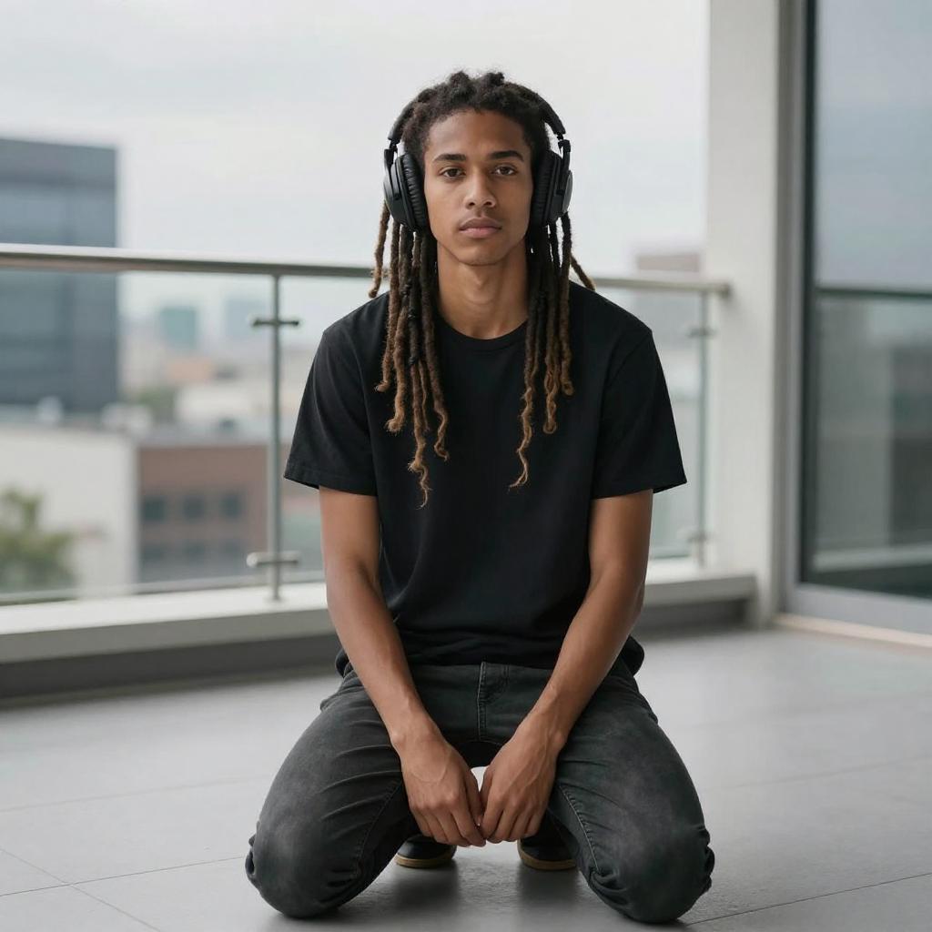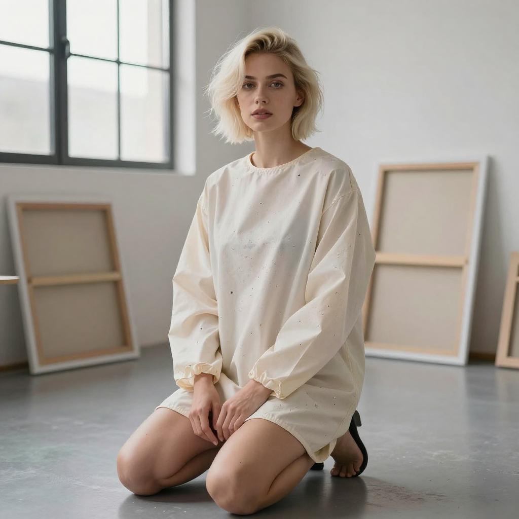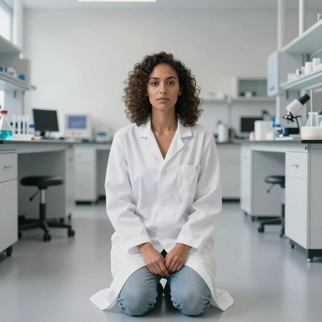 Photorealistic editorial portrait of a young female yoga instructor with braided hair and athleisure wear kneeling on a gray floor in a bright sunlit yoga studio with wooden panels and large windows. Direct confident gaze at the lens, soft natural morning light filtering through blinds sculpting facial features and gentle highlights. Clean minimal interior, subtle glass reflections, balanced composition, shallow depth of field, refined color grading, natural skin texture, crisp details, contemporary mood, high-resolution, professional styling, elegantly posed, negative space preserved, symmetrical lines, polished yet realistic finish.