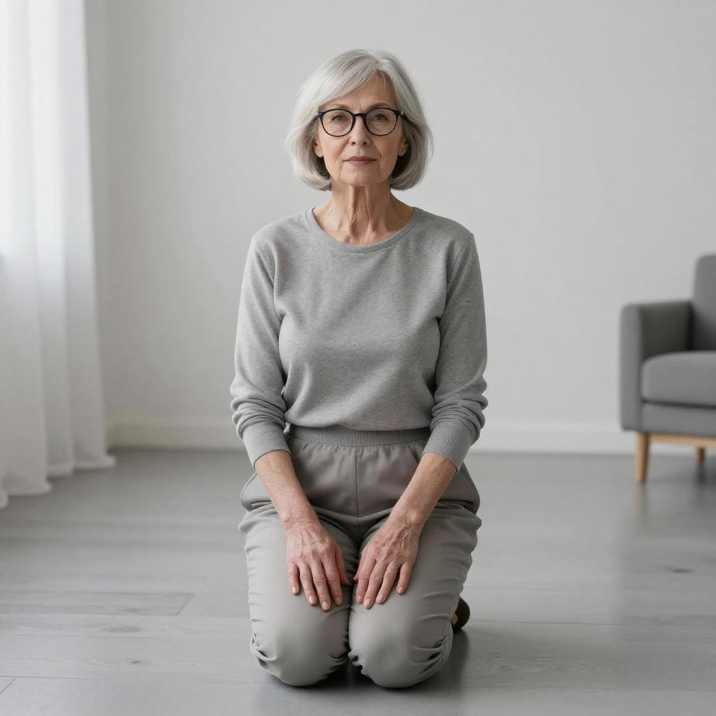 Photograph of a young woman with braided brown hair, wearing a gray sports bra and high-waisted leggings, kneeling on a yoga mat in