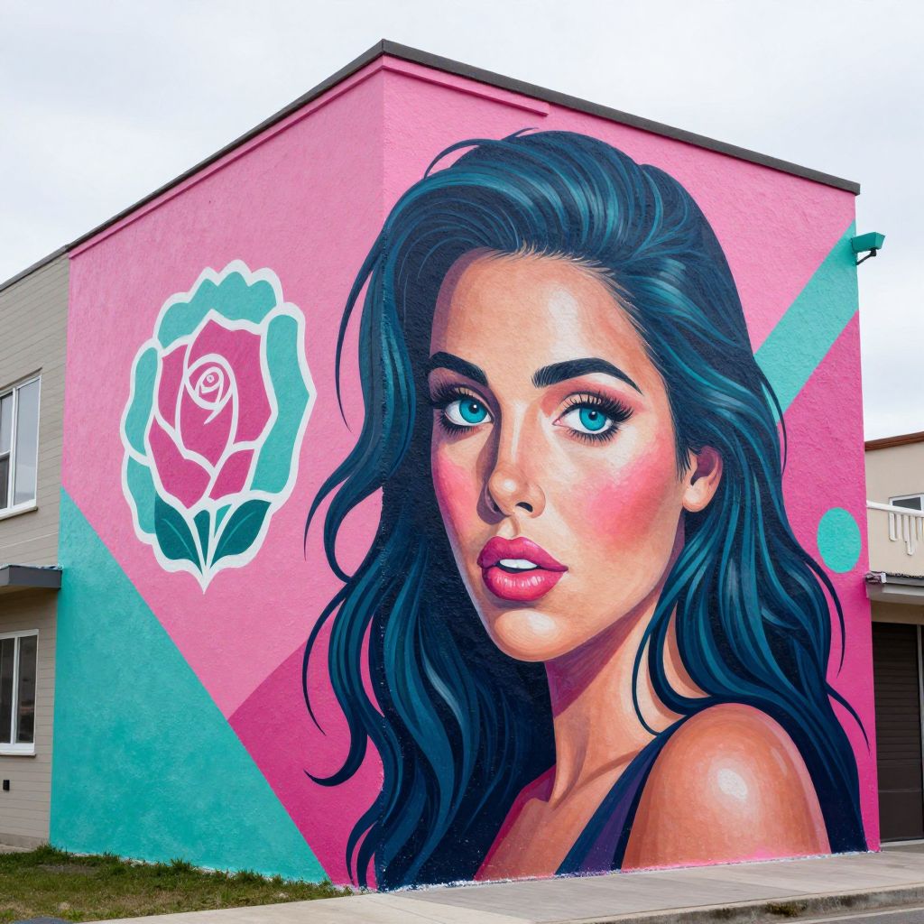 Vibrant street art of a blue-eyed woman with wavy black hair, pink lips, and rose tattoo on pink and green geometric building.
