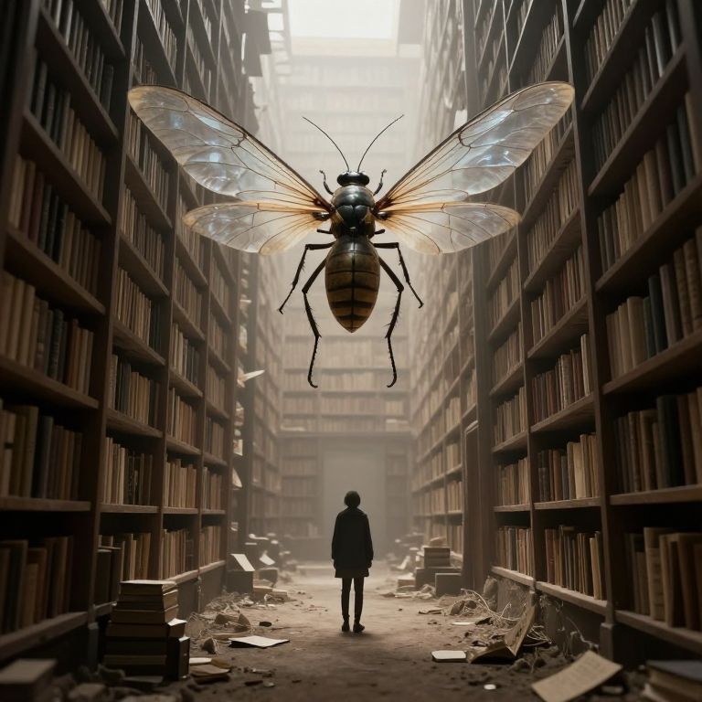 A photograph-like digital illustration depicts a vast, dimly lit library aisle with towering bookshelves on both sides. A giant, detailed insect with translucent wings and a segmented body hovers centrally above a solitary, silhouetted figure standing in the middle of the aisle. The figure wears a dark coat and looks up at the insect. The floor is scattered with fallen books and debris, and the background shows a misty, illuminated ceiling. The insect's wings reflect light, adding a surreal element to the scene. The overall atmosphere is eerie and mysterious.