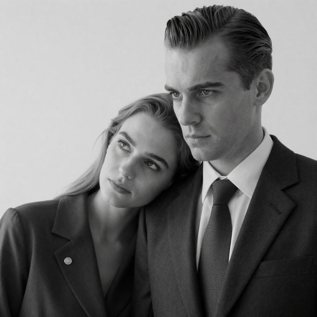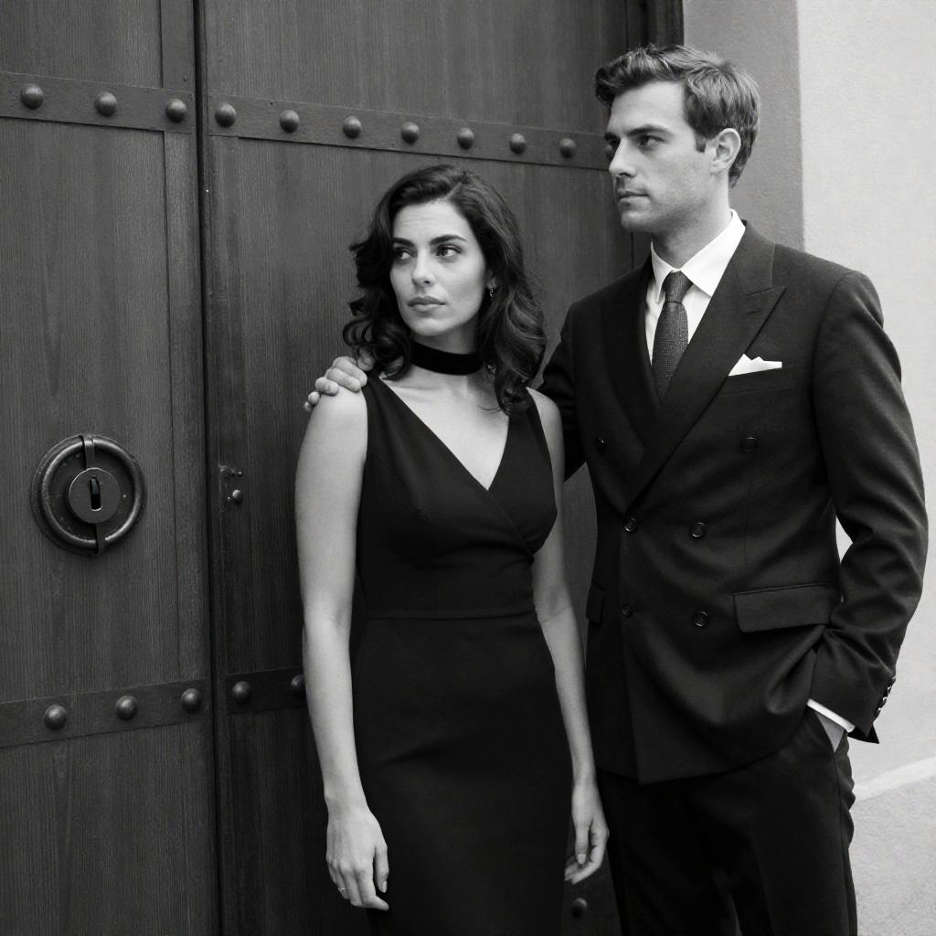 Black and white photograph of a man and woman standing next to a wooden door with metal rivets. Woman with dark hair, black dress, and choker, looking to the left. Man in double-breasted suit, white shirt, tie, and pocket square, looking to the right. Man's hand on woman's shoulder. Door has a large circular lock on the left. Woman's intense expression, man's neutral expression. Both standing closely.