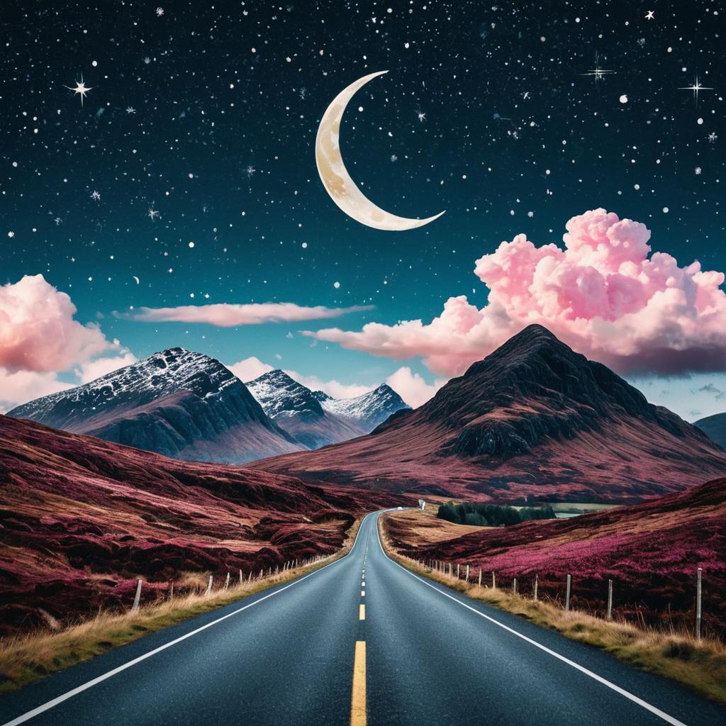 Spinning two-lane road leading toward mesmerizing Scottish Highlands, fluffy cotton candy clouds peeking from behind mountains, endless twinkling starry sky above, delicate slender waxing crescent moon hangs high above the clouds. Photoshop mixed media cutout artwork style, bright colors.
