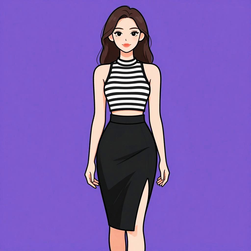 Woman with pretty face and pretty hair. Woman, casual streetwear, fitted short dress with horizontal stripes in shades of orange, beige, and white, high neck, short sleeves, thigh-length, straight-cut hem, minimal makeup, hair pulled back, white background. --sref 1461