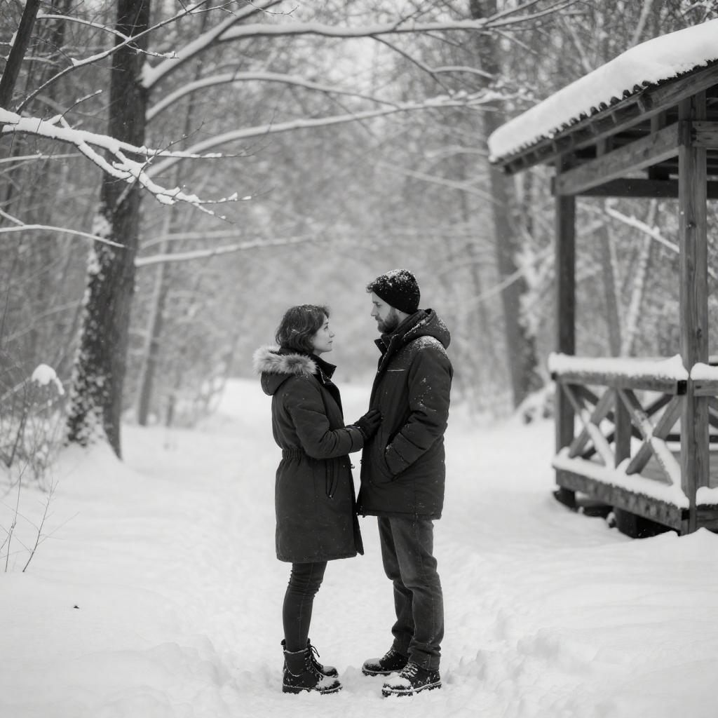 Black-and-white photograph of a snowy forest scene. A man and woman, both in dark winter coats, stand close, facing each other, with the man's hand on her waist. Snow-covered trees and a wooden structure with snow-laden branches are in the background. The woman has short hair, and the man has a beard.