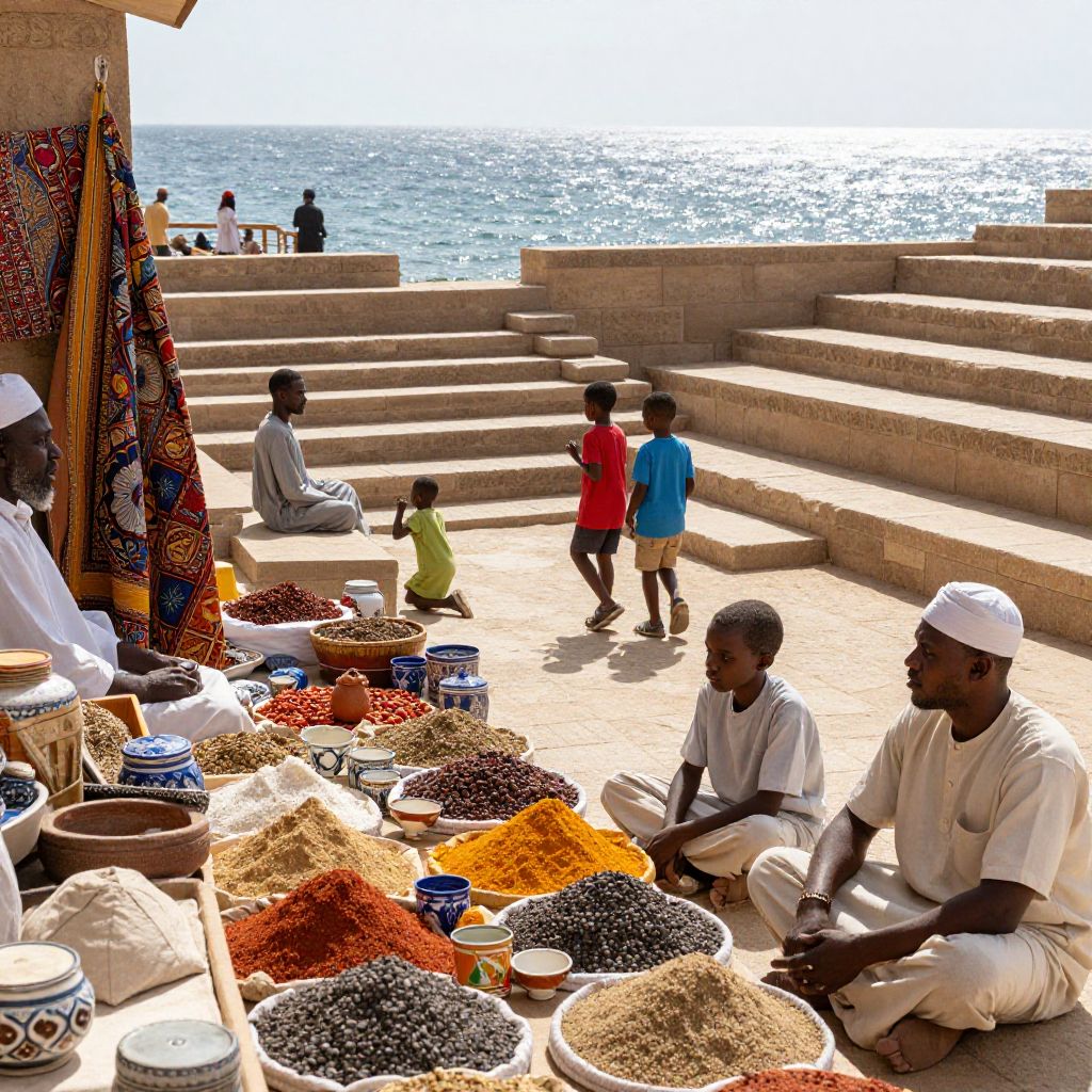 Photograph of a vibrant seaside market stall with colorful spices and textiles, two elderly African men in white, children playing, steps leading to the ocean in