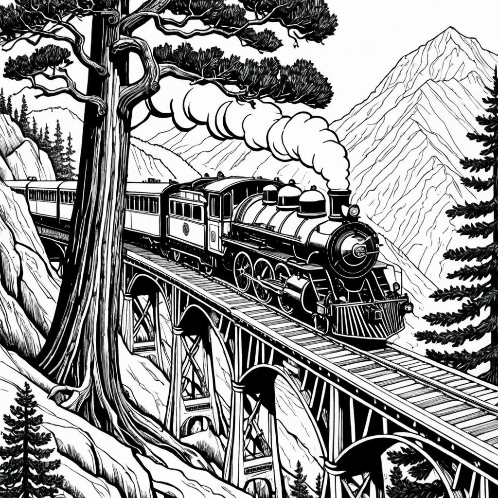 Sanded Paper Coloring page: An illustration of a vintage steam train crossing a mountain bridge, built on a massive sequoia tree, with winding branches, line art by Virginia Frances Sterrett, featured on DeviantArt. High-detail adult coloring book page with crisp, thin black outlines on a white background, designed for coloring.