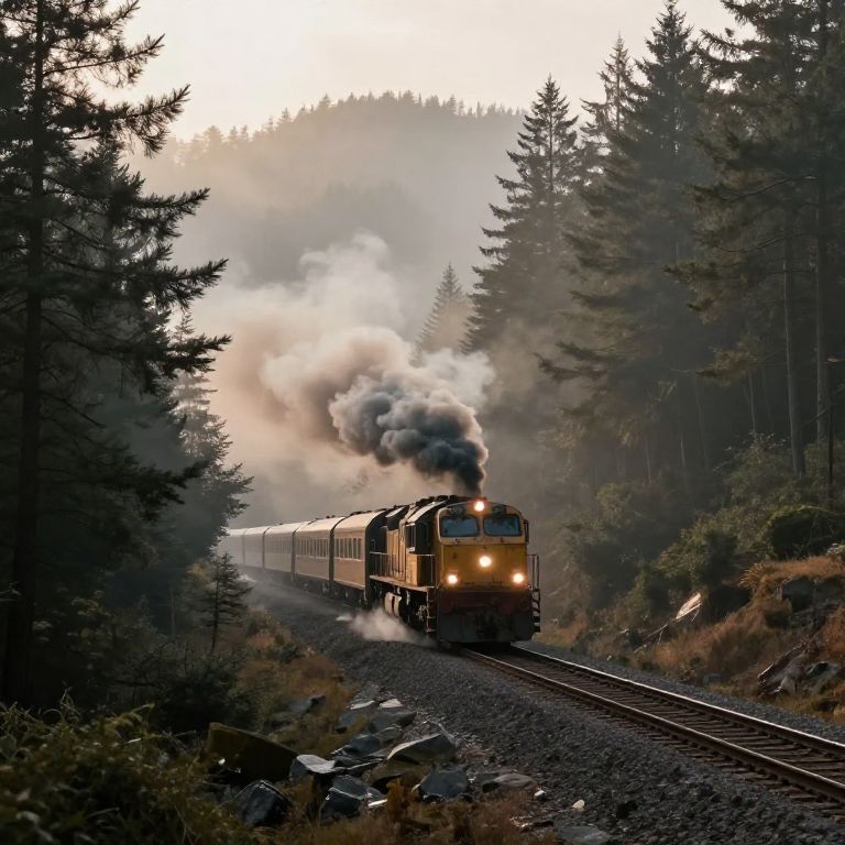 Distant smoke diesel train chugging through a misty mountain valley, early morning light filtering through tall pine trees, billowing dark smoke trailing behind.