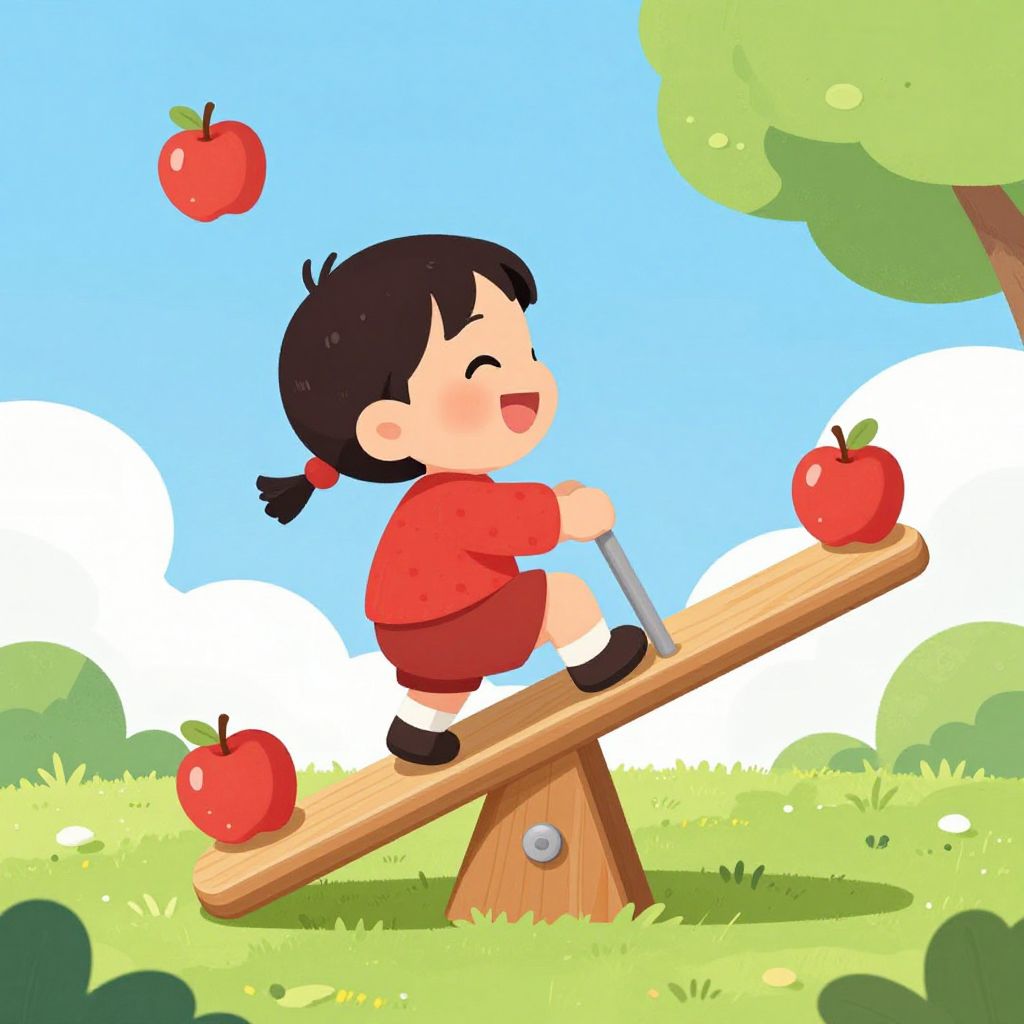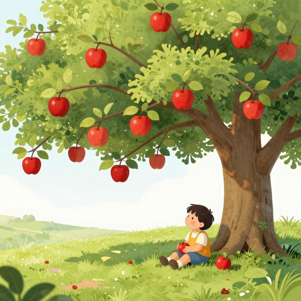 Digital illustration of a young boy with short black hair, sitting under a lush apple tree with vibrant green leaves and numerous red apples. The boy, wearing a white tank top and blue shorts, holds a red apple in his hand, looking up at the tree. The tree's thick brown trunk stands to the right, with sunlight filtering through the leaves, casting dappled shadows on the green grass. The background is a bright, clear sky with soft, glowing light. The overall scene is peaceful and idyllic, emphasizing nature and simple childhood joy.