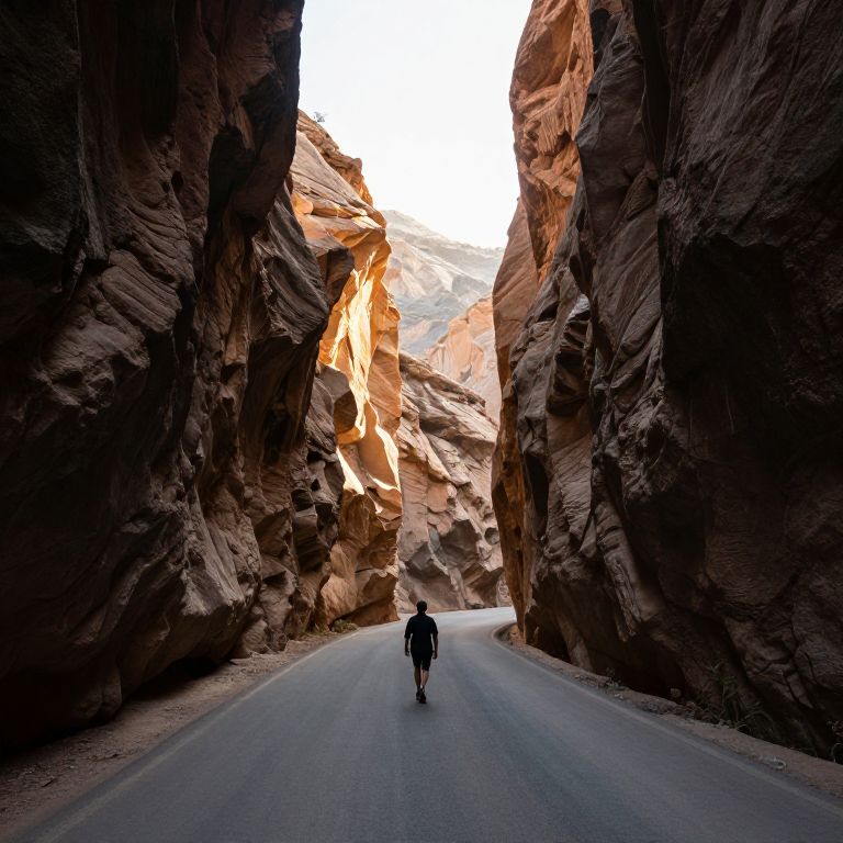 Sun-drenched canyon walls frame a solitary figure walking down a narrow, winding road, disappearing into the hazy distance where light and shadow converge.