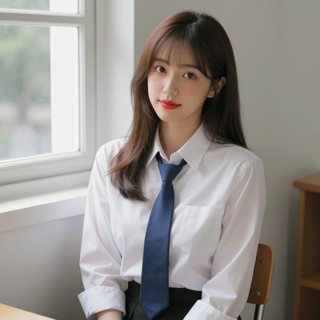 Asian woman with long brown hair, bangs, and red lipstick, sitting by a window. Wearing a white shirt, blue tie, and black pants. Light skin, medium breast size, slight smile. Background: window and light grey wall. Wooden chair on the left. Soft daylight.