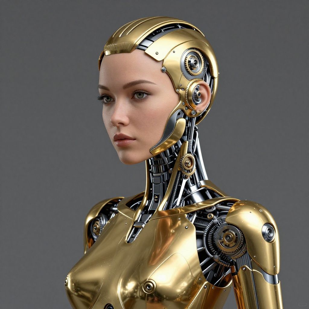 This image portrays a highly detailed female android with an elegant blend of human features and intricate golden mechanical design. The artwork highlights a futuristic cybernetic aesthetic with smooth metallic surfaces, exposed gears, and polished components, embodying the perfect fusion of technology and humanity.
