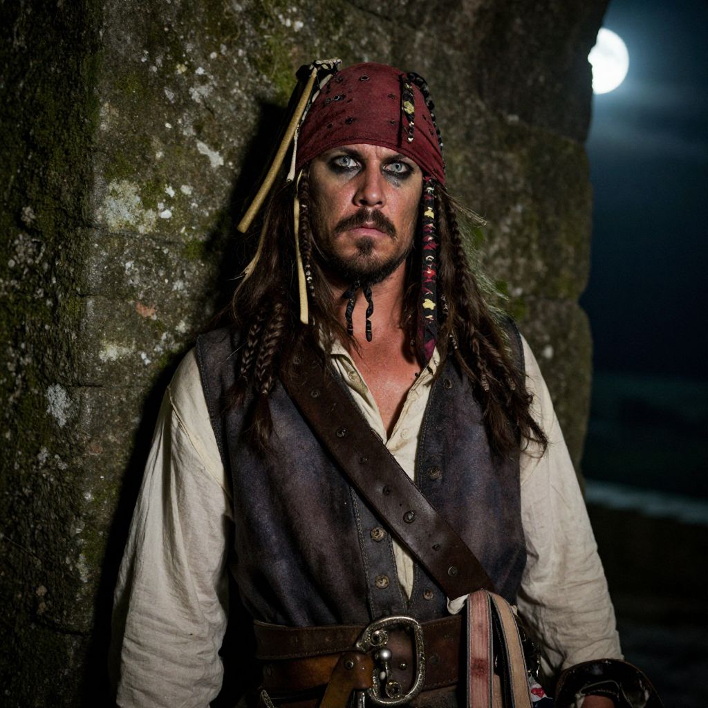 A man in a pirate costume is standing in front of a stone wall. He has a rugged, weathered face with a permanent scowl, wearing a red bandana tied around his neck. His eyes are sharp and piercing, reflecting the dim light of the moonlit night. The pirate costume is well-worn, with a tattered flag on his back and a sword at his side. The stone wall is ancient and moss-covered, adding to the eerie atmosphere of the scene.