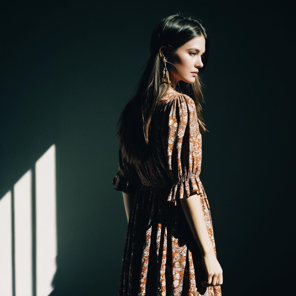 Portrait of a young woman with a long mullet hairstyle wearing a brown patterned boho dress. She is captured in profile against a dark background with dramatic lighting and harsh shadows, showcasing a fashion editorial style. The woman has light skin and long, straight dark hair and accessorizes with statement earrings.