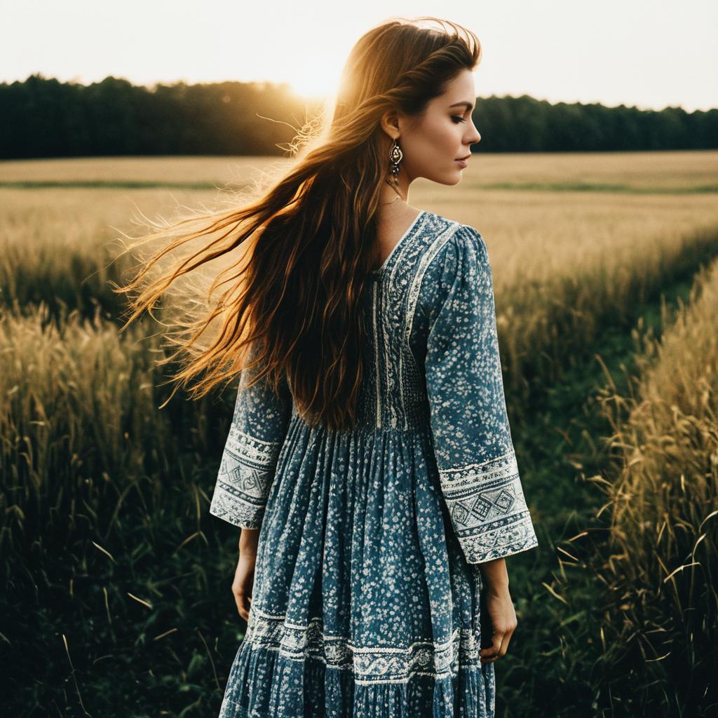 Long Mullet hairstyle on woman, wearing boho dress, in studio, captured in fashion editorial style with harsh shadows.