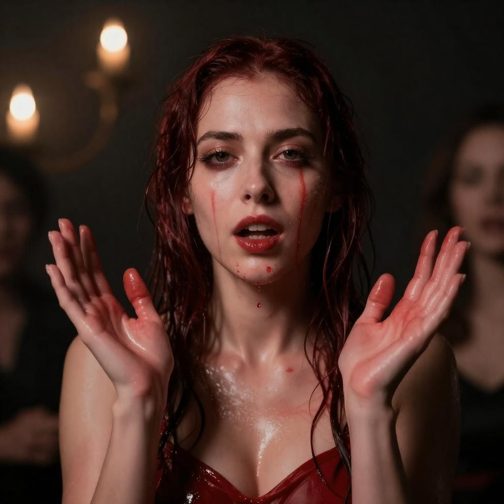 Photograph of a woman with wet, dark red hair, covered in red liquid, hands raised, palms open. Background is dark with illuminated lights. Red liquid drips down her face and chest. Another person partially visible on the right. Intense facial expression.