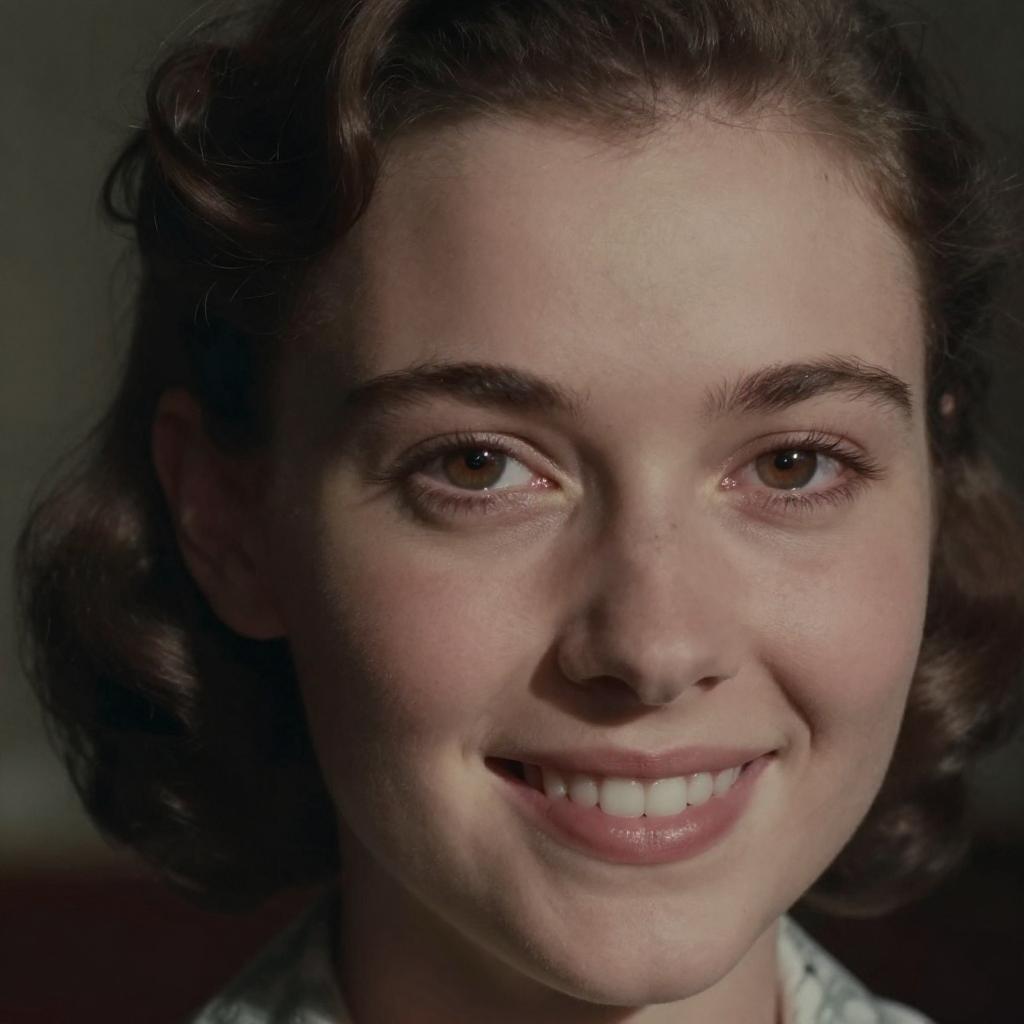 (close-up, editorial photograph of a 20 yo woman from the 1940's), (highly detailed face:1.4) (smile:0.7) (background inside dark, moody, POV, by lee jeffries, nikon d850, film stock photograph, 4 kodak portra 400, camera f1.6 lens, rich colors, hyper realistic, lifelike texture, dramatic lighting, cinestill 800