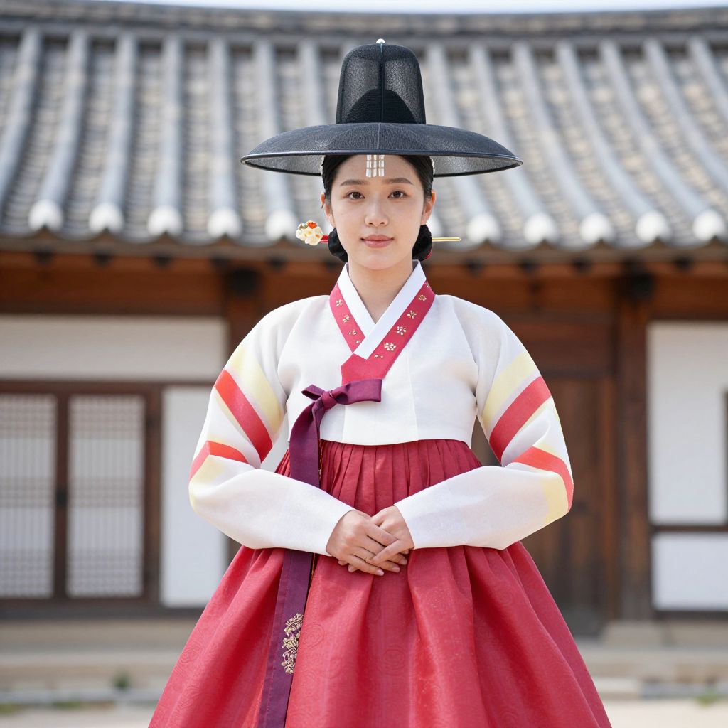 Photograph of an Asian woman standing in front of a traditional Korean building with a tiled roof. She wears a black, wide-brimmed hat, a white long-sleeve top with red stripes on the sleeves, and a red, high-waisted, full-skirted hanbok. Her hair is neatly tied back, and she has a white decorative mark on her forehead. She stands with hands clasped in front, exuding a calm, composed demeanor. The background features wooden doors with white lattice panels and a sunlit tiled roof. The bright colors of her attire contrast with the muted background, highlighting her traditional Korean attire.