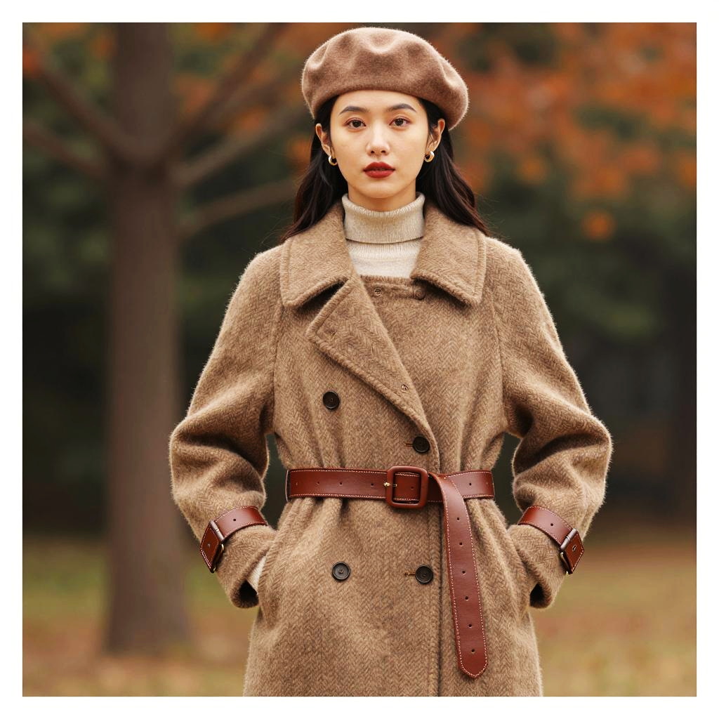 A woman stands confidently in a vintage-inspired cozy fall outfit, featuring a textured wool coat cinched with a brown leather belt and a matching beret. The photorealistic editorial portrait captures the warm autumn tones of the background, complemented by the stylish and timeless aesthetic of her ensemble.