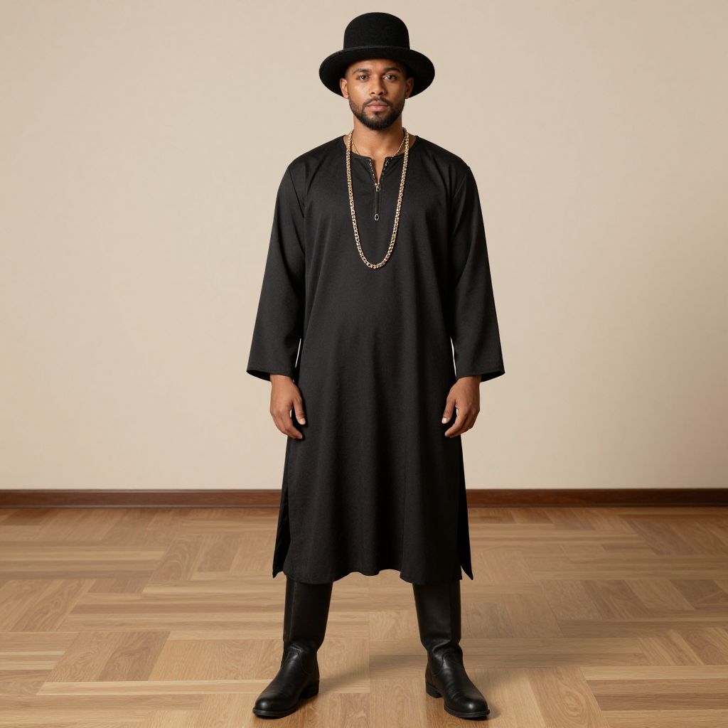 Photograph of a Black man standing against a plain white wall and wooden floor. He has a trimmed beard and wears a black wide-brimmed hat, a long black tunic with loose sleeves, black pants, and black boots. A long gold chain hangs around his neck. He stands with a neutral expression and relaxed posture. The tunic's hem slightly touches his calves, and the wooden floor has a light brown, herringbone pattern. The image is well-lit, emphasizing the simplicity and contrast of the black outfit against the white background.