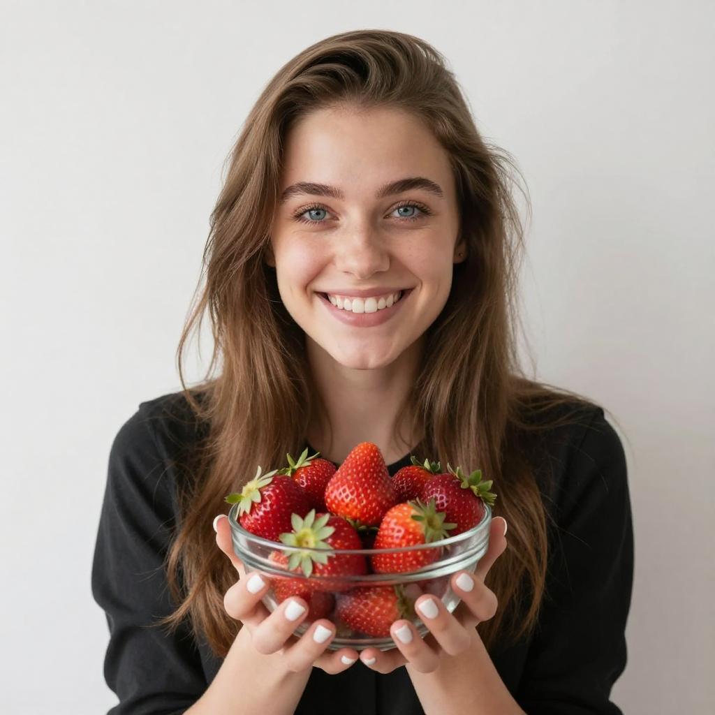 Photograph of a smiling young woman with long brown hair and blue eyes, holding a clear glass bowl filled with bright red strawberries in both hands. She's wearing a black shirt and has white nail polish. The background is a plain white, making her and the strawberries the focal points. Her expression is cheerful and inviting.