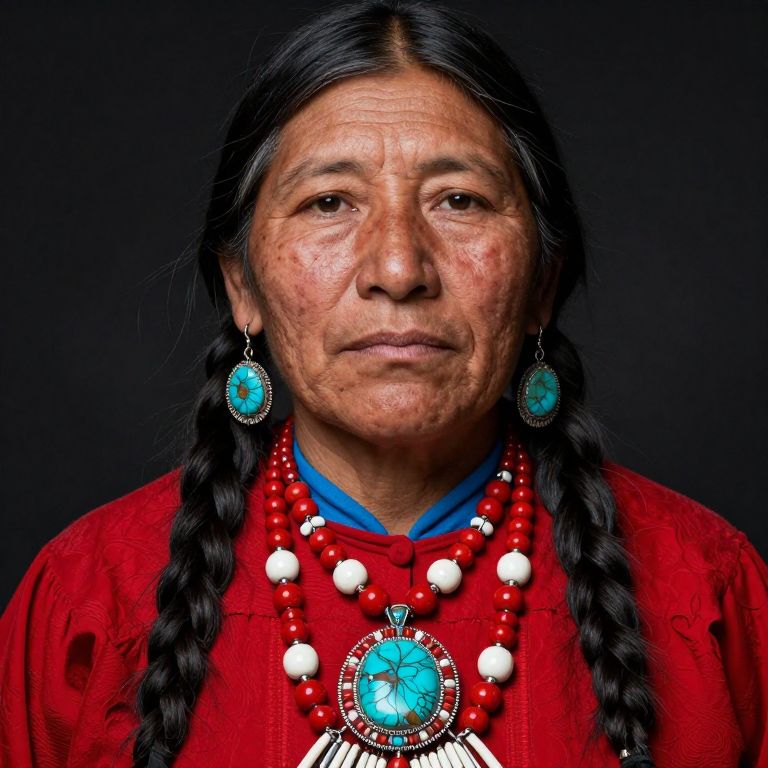 The image depicts a realistic portrayal of a Navajo person from the United States. The individual is adorned with intricate jewelry, including a turquoise necklace with red and white beads, a turquoise pendant, and matching earrings. The person is wearing a red shirt with a blue collar, and their hair is styled in braids. The background is dark, which contrasts with the vibrant colors of the jewelry and clothing, emphasizing the details and textures. The overall composition is centered, with the person's face and upper body occupying the majority of the frame, creating a sense of focus and intimacy. The interplay of colors, textures, and shapes in the jewelry and clothing highlights the cultural significance and craftsmanship associated with Navajo art.