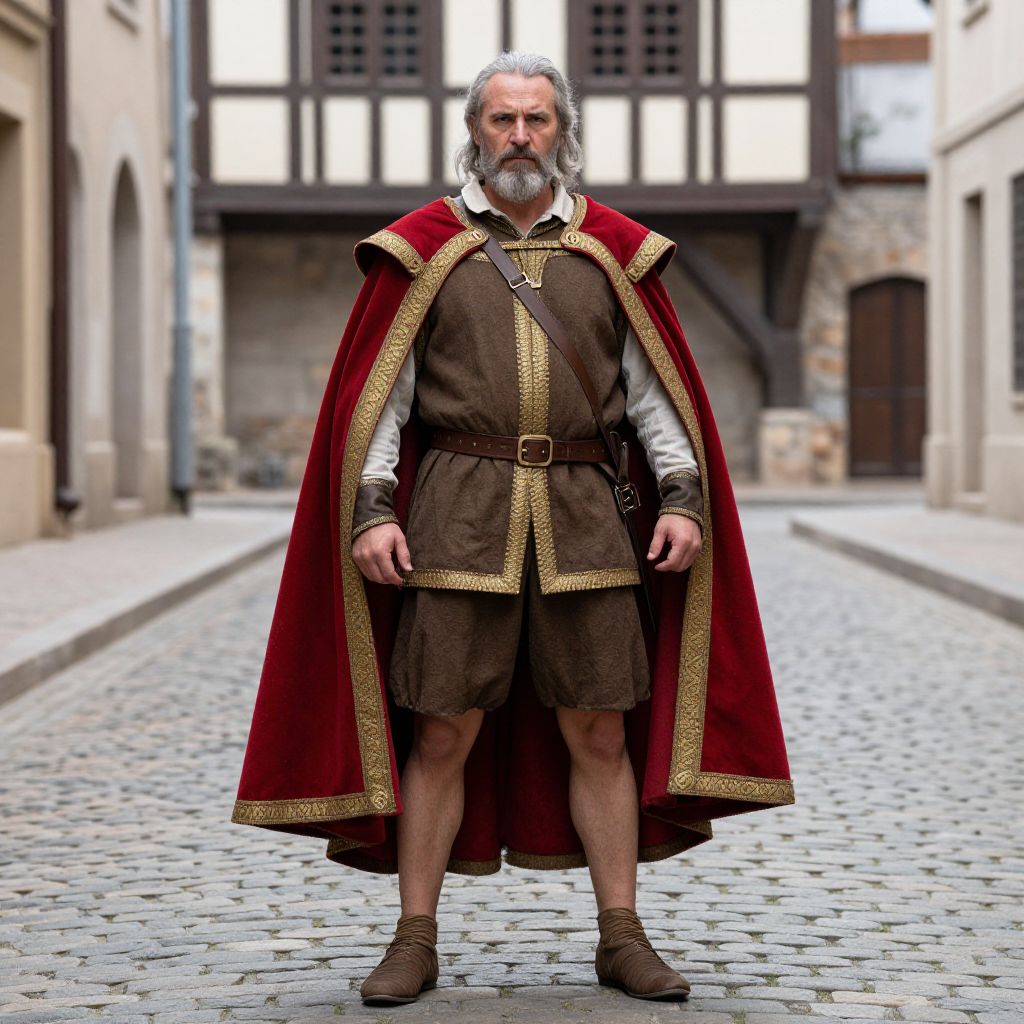 A man with grey hair and a beard, wearing a medieval costume with a red and gold cape and brown shorts, standing on a cobblestone street with a building in the background. The man has a strong, rugged appearance, with a determined expression. His clothing is well-worn but elegant, and the red and gold colors contrast sharply with the brown shorts. The cobblestone street is lined with old buildings, and the background building adds a sense of historical authenticity. The scene is set in a medieval town, with the man appearing to be a seasoned traveler or a local figure with a deep connection to the area.