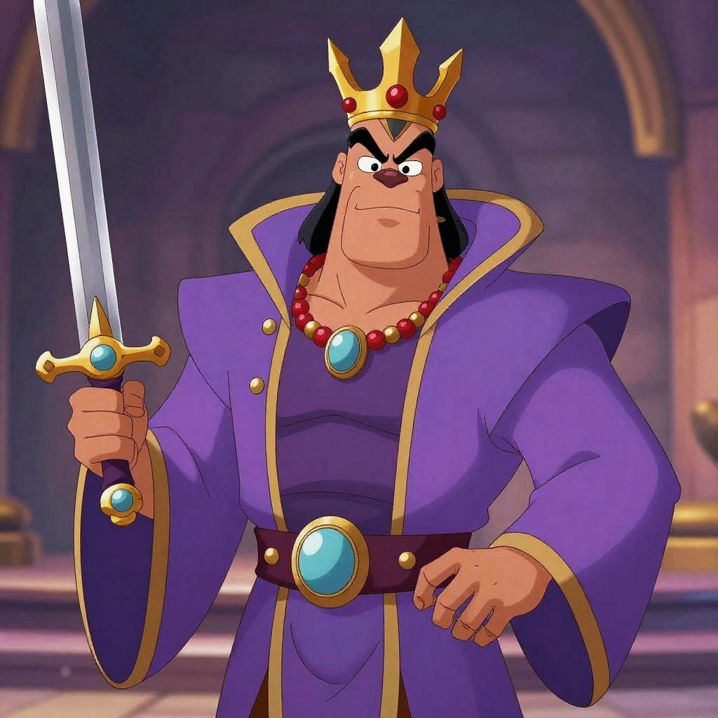 Kronk Yzma, in a purple outfit with a crown and a sword