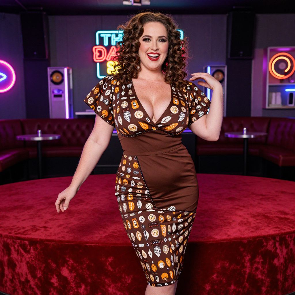 Photograph of a smiling, curvy woman with fair skin and long, curly brown hair standing on a red, circular velvet stage. She wears a brown, short-sleeved, deep V-neck dress with a white, orange, and yellow patterned design. The background features dark walls with neon signs, including "THE DIVE BAR," and red velvet sofas. The lighting is bright, highlighting her figure and the vibrant colors of her dress. She poses confidently with one hand on her hip and the other brushing her hair, exuding a retro, pin-up style.