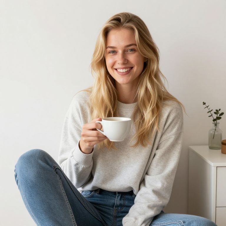 Blonde Instagram girl smiling with a coffee cup in cozy indoor setting, minimalistic Scandinavian décor, soft natural light, casual outfit, warm and inviting mood, lifestyle shot