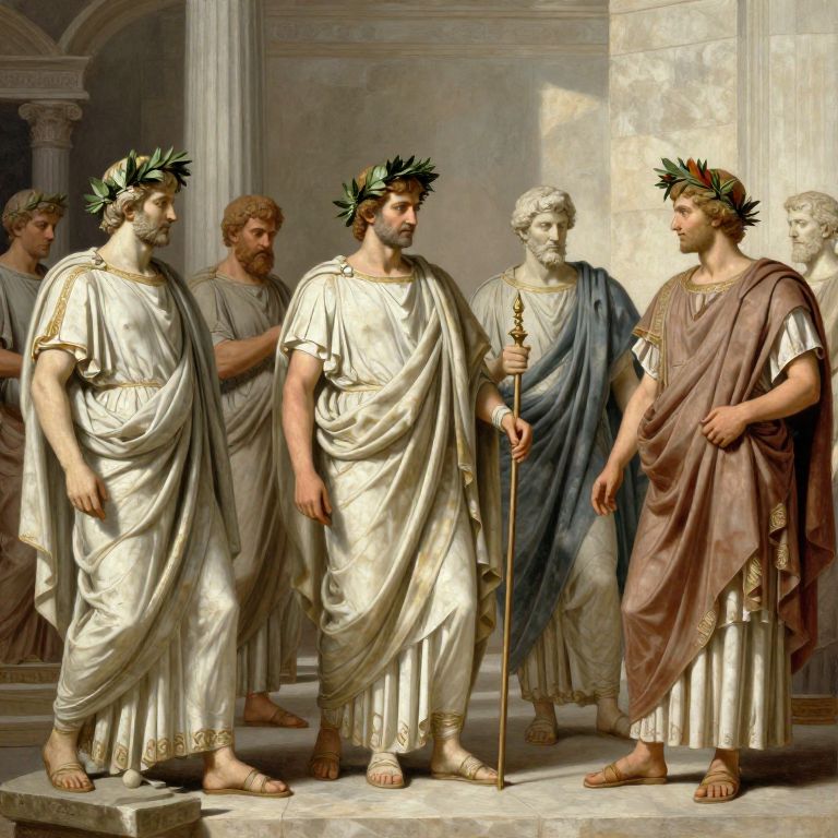 Ancient judges in a classical amphitheater setting, wearing togas and laurel wreaths, marble statues and columns in the background, sunlight casting shadows, historic legal scene, detailed and realistic painting style.
