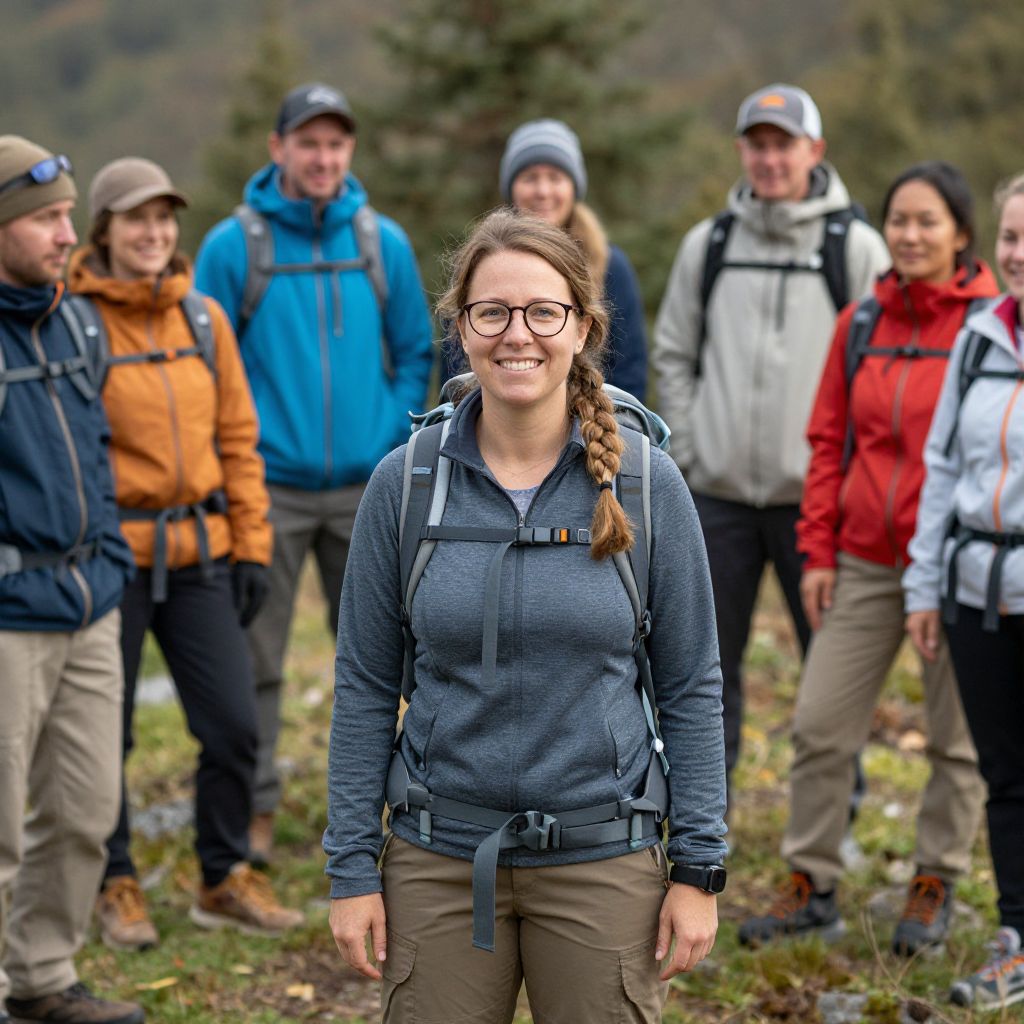 Photograph of a smiling white woman with glasses and brown hair in a braid, standing in the foreground wearing a gray hiking shirt, brown pants, and a black backpack. She is surrounded by six other hikers in the background, dressed in various brightly colored outdoor jackets and pants, including blue, orange, white, and red. They are standing on a grassy, slightly rocky hillside with evergreen trees and a forested background. The hikers appear to be a diverse group, smiling and engaged, suggesting a friendly, outdoor adventure. The image has a natural, vibrant color palette and a slightly blurred background to emphasize the woman in the foreground.