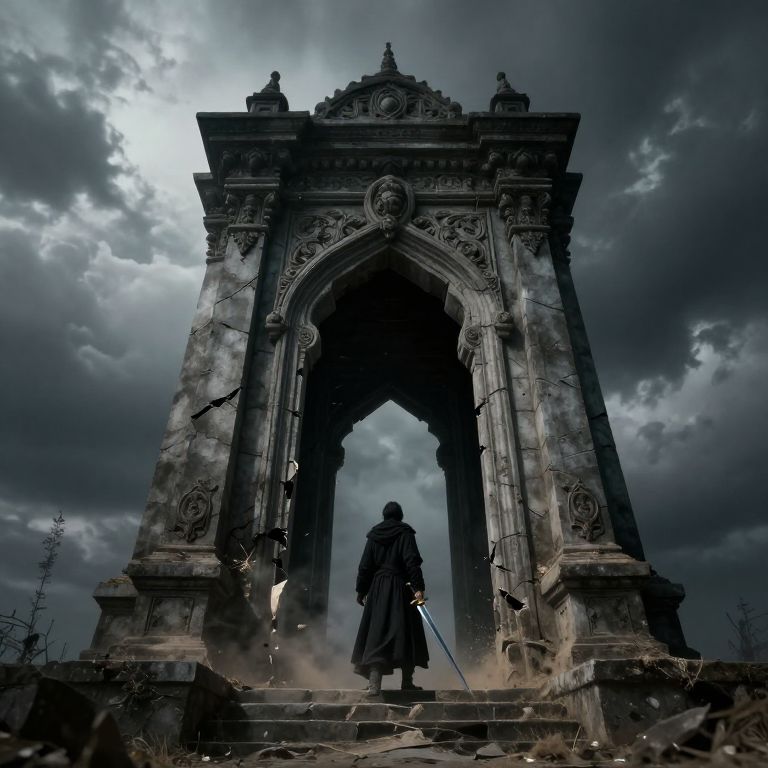 A shattered tower rises against the sky, He draws his sword, and steps into the gape that once served as doorway, Within is silence, the odor of dust and damp stone, Dark, mysterious, haunting, dramatic, ornate