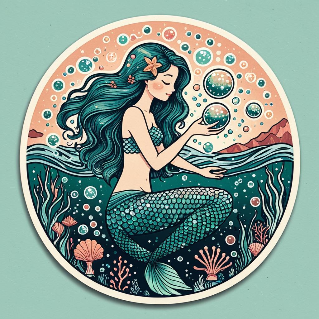 A gentle mermaid in a sticker naive art style, with smooth gradients, magical bubbles, creating a whimsical and approachable aesthetic.