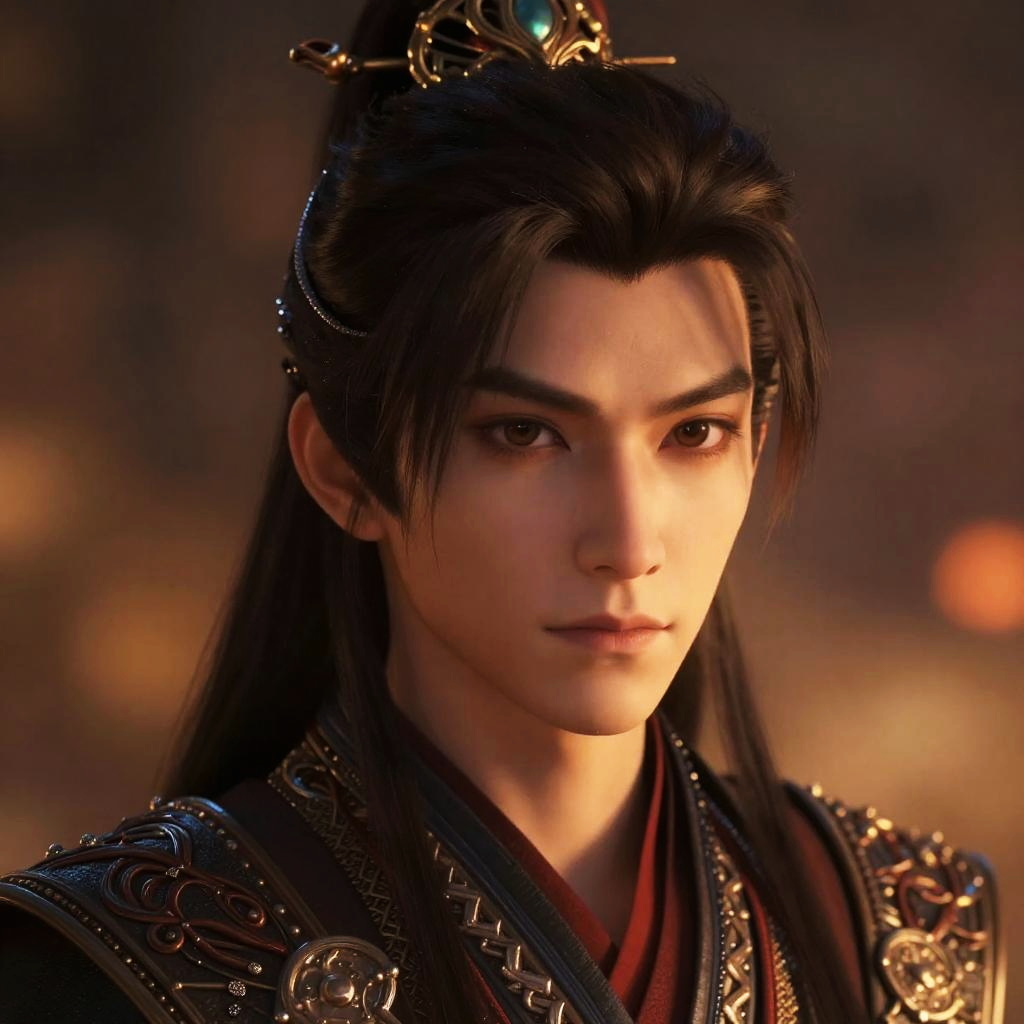 Close-up portrait of a young male anime-inspired warrior with an intricate hairstyle and traditional armor, illuminated by soft firelight. The intense gaze and detailed textures highlight high-resolution artistry against a warm glowing background.
