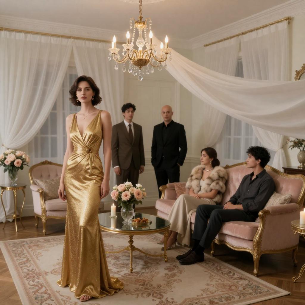 Bald man wearing a brown suit and red bow tie stands in an opulent room with rich warm lighting. Behind him is a white-skinned woman with dark hair, wearing a gold and white dress, raising her arms. The background features ornate dark curtains with red drapes and decorative objects, creating a luxurious setting. Both subjects are centered in the frame with serious expressions.