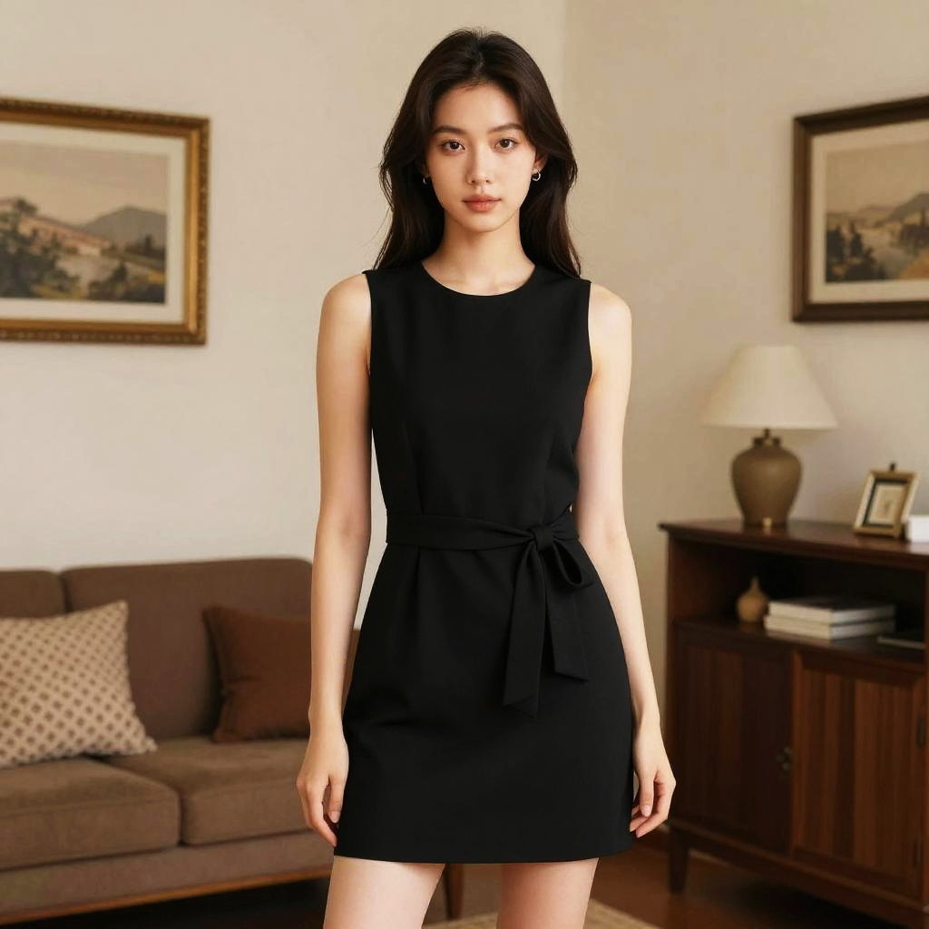 A poised young woman stands elegantly in a cozy home environment, wearing a stylish black sleeveless dress with a tied waist detail. Her confident stance and the tasteful interior design give the scene a sophisticated ambiance.