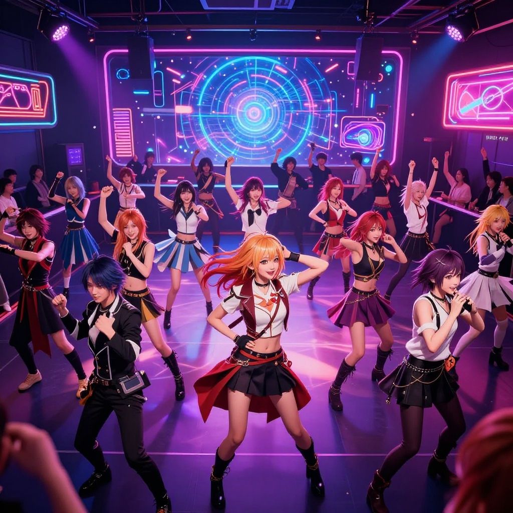 Digital anime artwork of a vibrant, neon-lit dance club featuring a diverse group of energetic, stylish girls in school uniforms performing on stage under colorful,