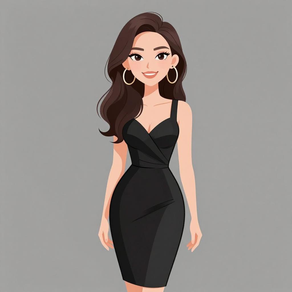 Woman with pretty face and pretty hair. smiling Woman, chic, black sleeveless dress with a plunging v-neckline, draped fabric across the torso, fitted silhouette, above-the-knee hemline, large hoop earrings, sleek hairstyle. --sref 1467