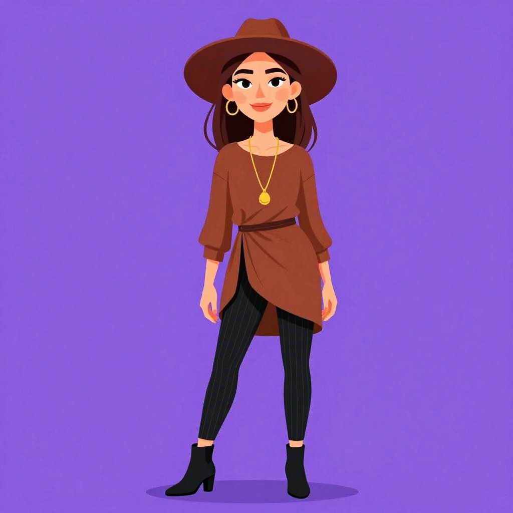 Digital illustration of a smiling woman with tan skin, wearing a wide-brimmed hat, chevron-patterned blouse, beige pants, gold hoop earrings